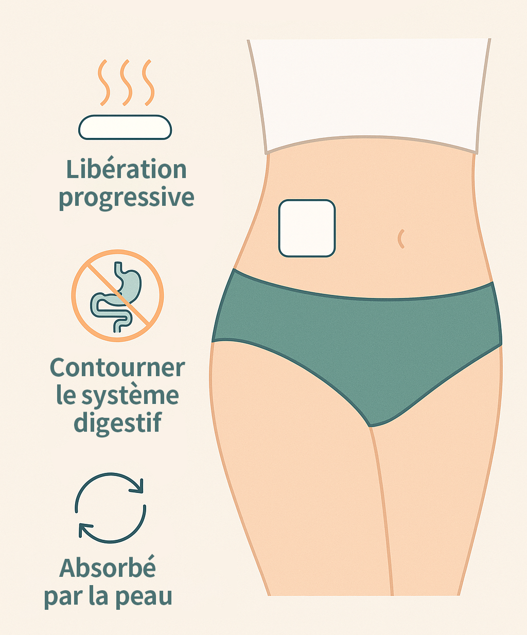 Nos patchs offrent un avantage certain par rapport aux comprimés : ils libÚrent les ingrédients directement dans la circulation sanguine, contournant ainsi le systÚme digestif, pour des résultats plus rapides et plus efficaces.