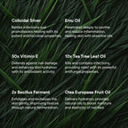 Incluye plata coloidal, aceite de emú, vitamina E, aceite de árbol de té, fermento de bacillus y escualano.